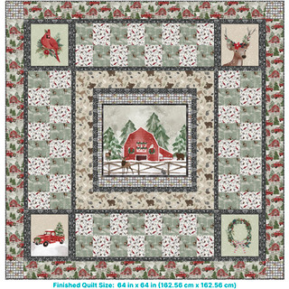 “Christmas in the Country” by Elaine Kay for 3 Wishes fabric is a 7-SKU collection that depicts a wondrous, wintry landscape. The panel measures 24” x 42”. There are 4 blocks within the panel that each measure 9.5” x 10.5” and the focal block measures 20” x 17”. Beautiful wildlife and a rustic barn scene are the focal points of each block. Other designs include an allover barn scene that beautifully conveys the serenity of a snowy countryside, a tossed wintry bird and foliage print, a tonal kaleidoscope print that features trees, stockings and presents, as well as 2 wildlife designs.