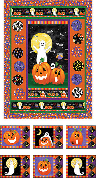 Jump into the spooky Halloween season this fall with Sharla Fults' new collection, ‘Spooky Friends.’ This collection is sure to treat you with designs of spider webs, spiders, candy, bats, owls, pumpkins, and ghosts, all in the classic black, orange, purple, and green Halloween palette. The 24-inch panel features six blocks, each with a ghost or a spooky pumpkin inside, backgrounded in spider webs and bordered by pumpkins. The other 24-inch panel illustrates a happy ghost with two jack-o-lanterns and a little owl in a spooky nighttime scene. Each one of these 13 patterns are glow in the dark and are sure to make a memorable Halloween.